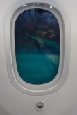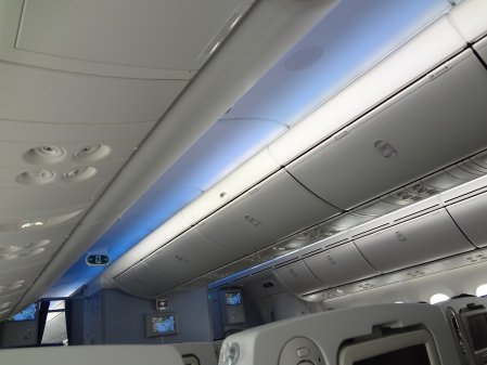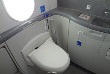 窓にはシェードがなく、エレクトロクロミズム(?)を使った電子カーテンが使われ乗客各自が窓の透過光量を調整できるようになっています。 電子カーテンを最も明るくした窓(左)と最も暗くした窓(右)。 窓の下のボタンで調整。 トイレにも窓が付いていました。 トイレは少し広めで、清潔な感じ。