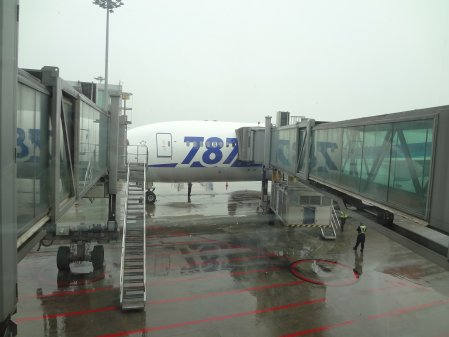 朝の成田空港は混雑していました。 夏休みに入って最初の土曜日だからでしょうか。離陸の順番待ちで飛行機が渋滞。40分ほど遅れて離陸。 成田から北京へは、あの787型機でした。トラブルなしで無事に北京に着くようにと念じました。 左の画像は、北京に着いたときに撮ったものです。
