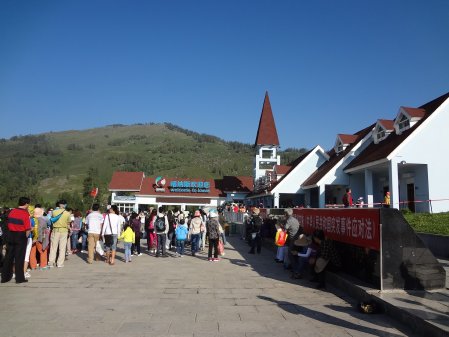 観光センターから、また専用バスで観魚亭のある山の中腹まで行きます。そこからは歩いて観魚亭を目指します。