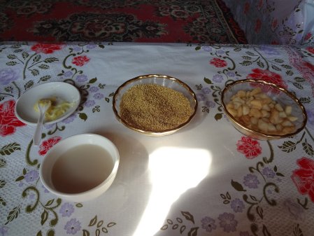 nǎijiǔというミルク酒がだされました。日本酒のようないい香り。作法を教えていただきなめてみましたが、アルコール度も低く水のような味わいでした。